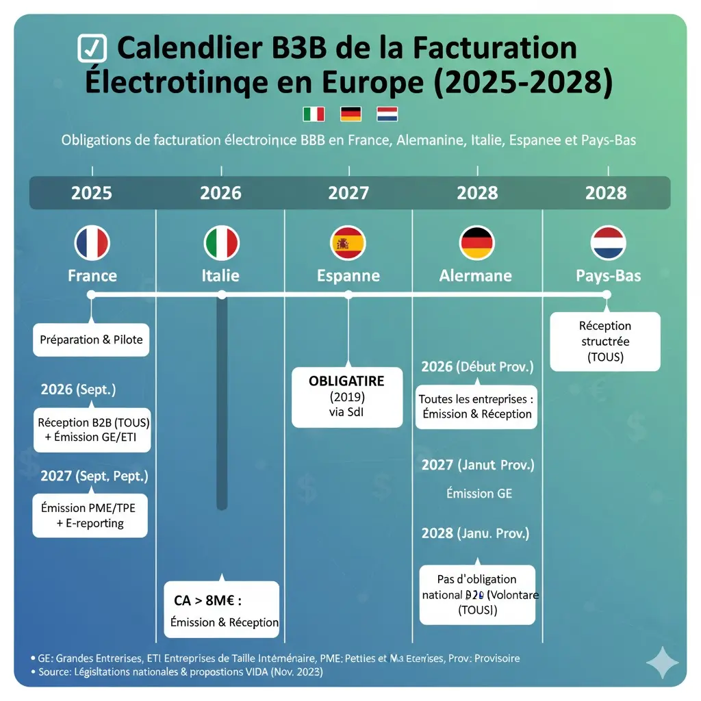 Analyse complète de l'e-invoicing en France, Allemagne, Italie, Espagne et Pays-Bas : calendriers, formats (Factur-X, PEPPOL) et obligations B2B 2025-2028